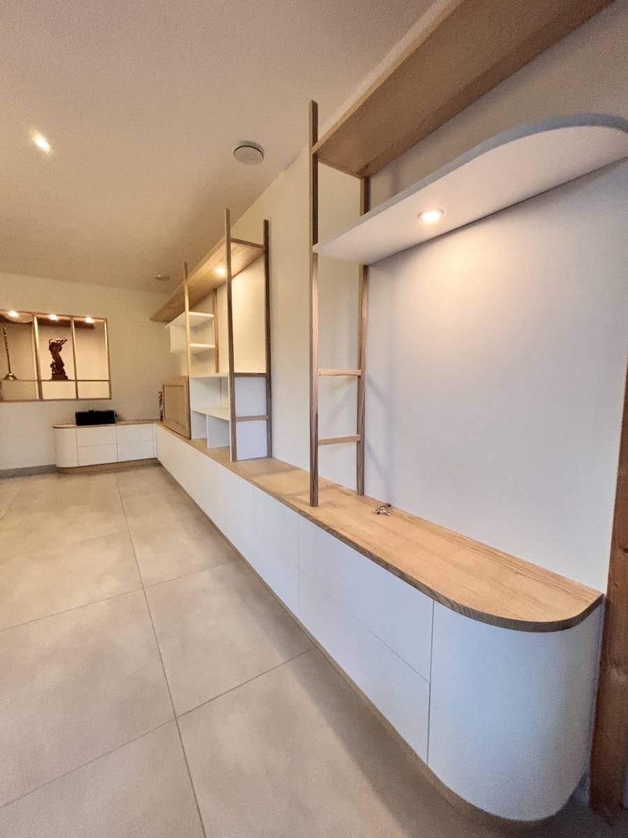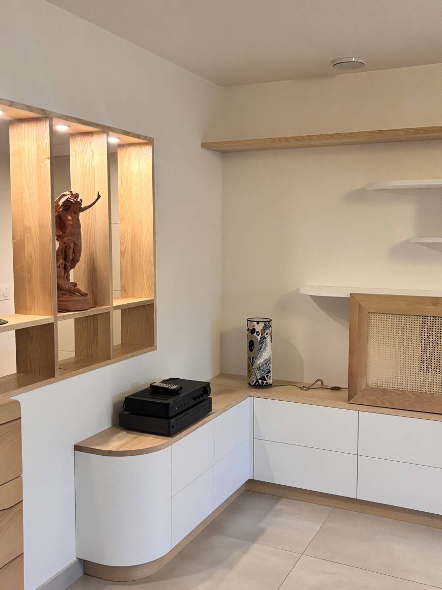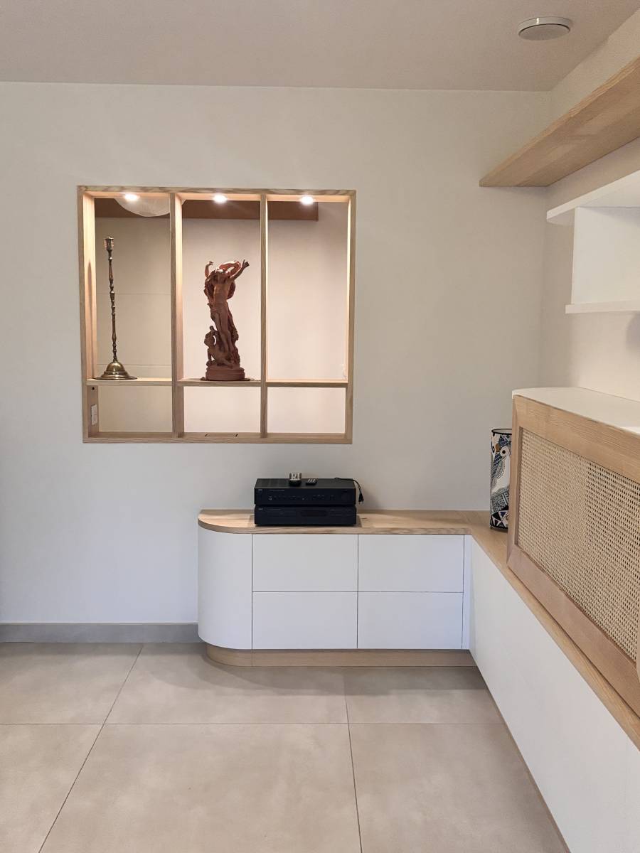 Le frêne, avec son grain délicat et sa teinte chaleureuse, dialogue avec la laque blanche satinée dans un jeu de contrastes subtils. Ensemble, ils dessinent une pièce à la fois apaisante et affirmée.