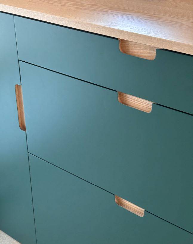 A l'autre bout de la pièce se trouve le meuble faisant la liaison avec la cuisine.Intégralement laqué en vert sapin avec de joli arrondis.Il accueil une niche avec un fond en frêne.Les poignées en frêne ont été usinée et assemblées aux portes.