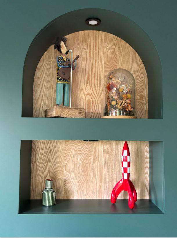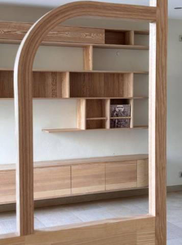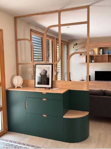 Puis pour l'accompagner et séparer l'entrée, un meuble en frêne et laqué vert sapin à prit sa place. Il est surplombé par un claustra au forme cintrées.