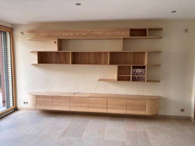 Bibliothèque en frêne massif, aux formes arrondies. Le choix de la suspendre lui confère une légèreté malgré ses 3,7 m de long.Fond rainuré, tiroir dissimulant un écran de videoprojecteur.