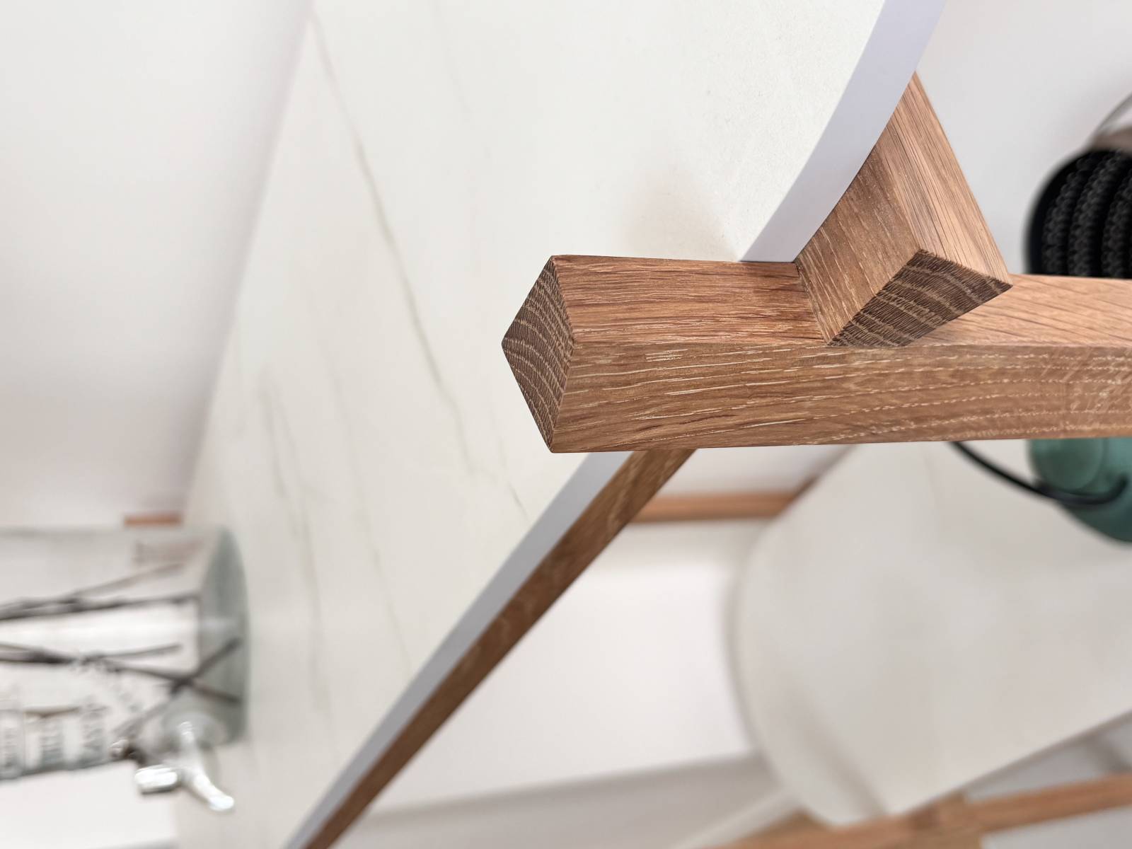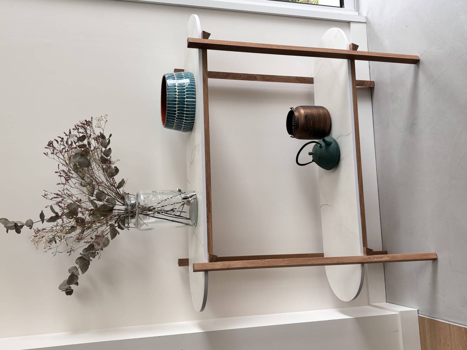 Console en chêne massif sublimée par un plateau en stratifié compact effet marbre de Paros. Une alliance pour une pièce à la fois contemporaine et intemporelle.
